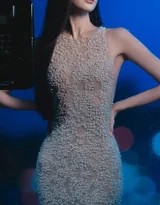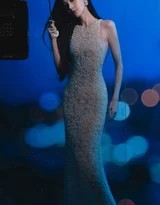 本次造型的核心在于“珍珠”与“透视”两大元素的精妙运用。娜扎所着的礼裙,以白色为基底,肩带与裙身缀满了圆润晶莹的珍珠,远观如星河倾泻,近看则每一颗都流淌着温润光泽,极大地提升了造型的奢华与高贵感[citation:1][citation:3]。设计上别出心裁地采用了贴身剪裁与局部透视薄纱,若隐若现地勾勒出她优越的肩颈线与曼妙的身材曲线,完美平衡了典雅与性感[citation:7]。珍珠链条随着她的姿态自然垂坠晃动,增添了一份灵动韵律,使得静态的画面充满了动态的生命力[citation:1]。