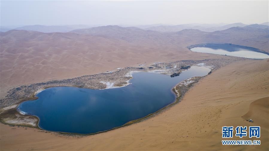 沙海中的湖泊,仿佛一颗镶嵌在金色绒布上的宝石。