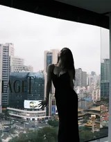 拍摄场景选择在视野开阔的落地窗前,这无疑是一个绝妙的构思。窗前,是私密的空间;窗外,是广阔的世界。她站在这个交界点上,身影被通透的光线所包裹。有些时候,日光成为她的唯一光源,纯净而直接地照亮她的面容与身体,肌肤在黑色裙装的映衬下显得愈发白皙通透,一种纯净的性感油然而生。而在另一些镜头中,或许已是暮色四合,城市的灯火与室内的暖光交织,为她镀上了一层朦胧而梦幻的滤镜,眼神中便多了几分故事感与慵懒的魅惑。