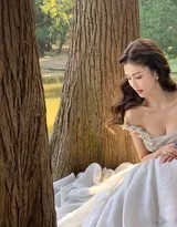 白色长裙作为整体造型的核心,其剪裁极具巧思。低胸设计恰到好处地展现优雅的肩颈线条,而流畅的裙身则勾勒出修长身形。在自然光的勾勒下,裙摆的布料随着白鹿的每一个转身或静立,呈现出不同的质感与褶皱,仿佛被注入了呼吸。这种“性感”并非刻意张扬,而是透过细节与动态自然流露,与户外环境的纯净气息相得益彰,营造出一种高级的、不染尘嚣的浪漫氛围。