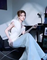 长裙的剪裁极为考究,它贴身而不紧绷,完美勾勒出祝绪丹纤柔曼妙的身姿曲线。无论是倚靠沙发时展现的流畅肩颈线,还是席地而坐时裙摆如花瓣般铺开的柔美弧度,都体现出一种“精雕细琢的艺术品”般的质感。这种摒弃繁复装饰、以剪裁和质感取胜的造型,正呼应了当下时尚圈所推崇的“低调的精致”——真正的奢华在于面料、剪裁与穿着者气质的和谐统一,而非元素的简单堆砌。
