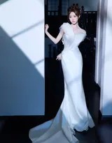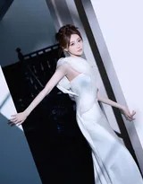 祝绪丹此次选择的礼服,是一件设计简约却不失细节的白色席地长裙。纯净的白色作为主色调,被誉为“比任何浓艳礼服都耐看”的高级选择,它不喧哗,却最能衬托穿戴者自身的气质。礼服面料垂顺,随着她的坐、卧、立等不同姿态,形成自然流畅的褶皱,如同月光洒在静谧湖面上泛起的涟漪,充满动态的柔和美感。