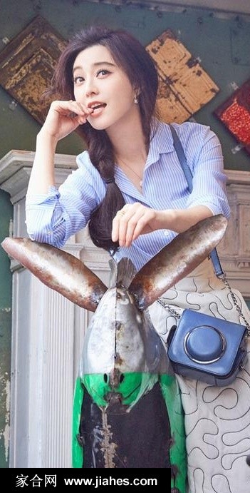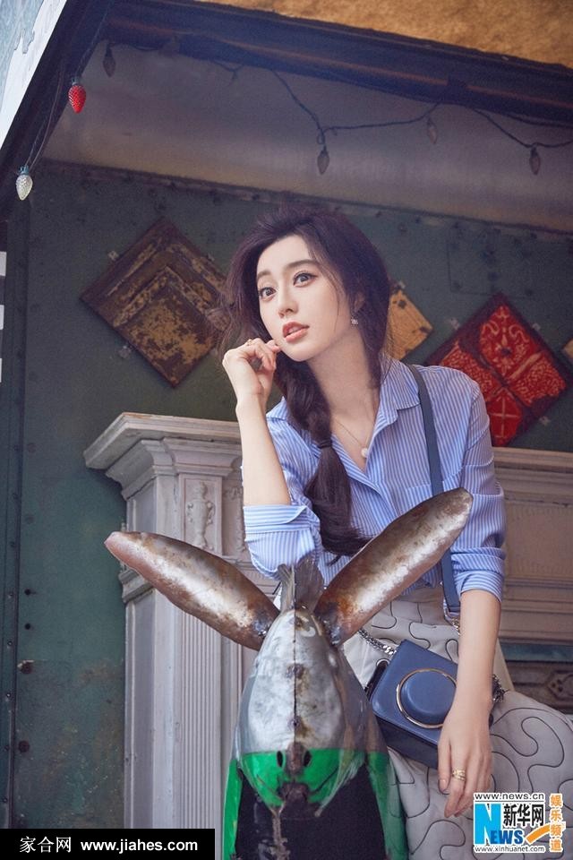 范冰冰蓝色条纹衬衫清新出游甜笑咬手指少女感满溢