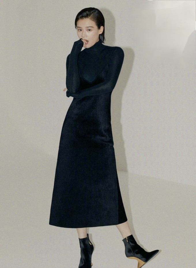 在另一组内页大片中,马思纯则展示了力量感的另一种形态。她换上一条气质深邃的暗色连衣裙,服装的柔滑质地与发型的硬朗形成有趣的碰撞。她或倚靠于结构感鲜明的背景中,或于光影交错间侧身回眸。此刻的她,少了一分封面的外放锋芒,多了一分内敛的沉静与故事感。这种柔中带刚的表现,证明了她对多样风格的驾驭能力——并非单纯地“扮演”强势,而是将女性气质中坚韧、独立的内核自然流露。