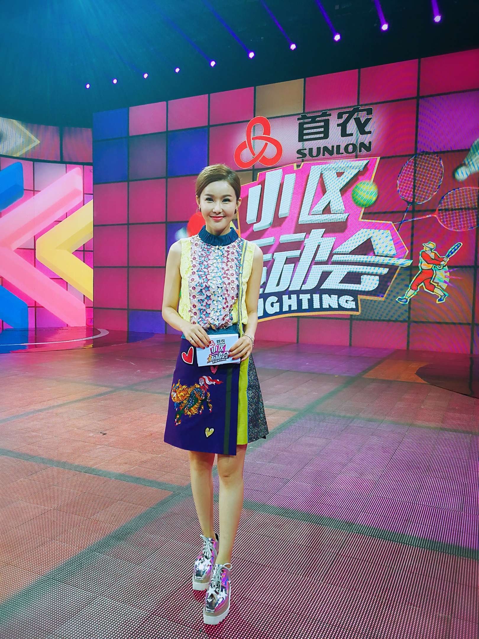 雅淇手持话筒与工作人员交流,专业装束在演播室灯光下显得格外醒目